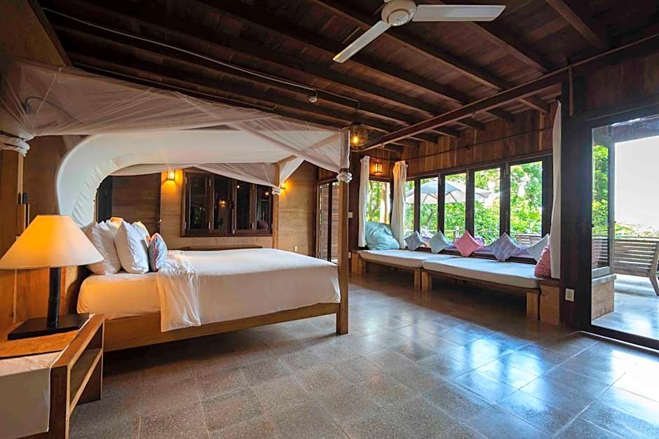 With natural rammed earth walls, this two-story villa is fitted with a balcony and a terrace on stilts. The bedroom features a four-poster king-sized bed and bay window. There is also an open-planned living room equipped with a lounge daybed, mini-bar and Nespresso coffee machine. Air conditioning on first floor and the private bathroom offers a hot shower facility.
